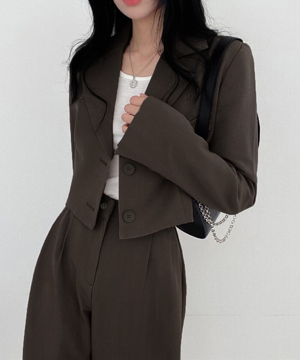 クロップドジャケットとハイウエストパンツの組み合わせが、上品でスタイリッシュなシルエットを演出