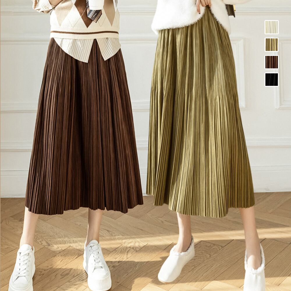 細かいプリーツデザイン、歩くたびに綺麗に広がるプリーツは女性らしさを演出するスカート