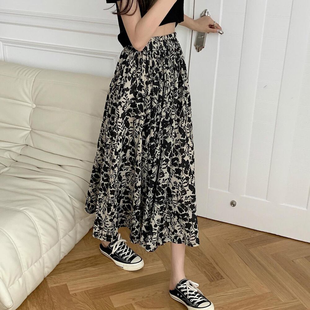 モノトーンベースで落ち着いた色合いの花柄スカートはシックな大人可愛さを演出してくれるロングスカート