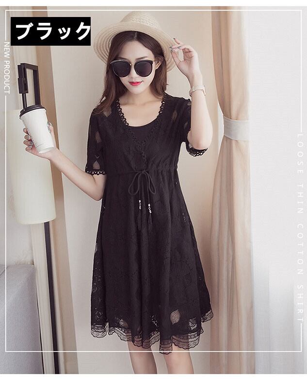 ワンピース 総レース Aライン Vネック 2点セット 体型カバー 大きいサイズ
