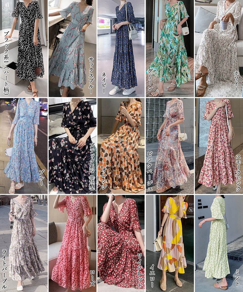 リゾートワンピース フラワーワンピース 着やせワンピ韓国風 軽やかに揺れるエレガントな印象を与えてくれるロングティアードワンピース