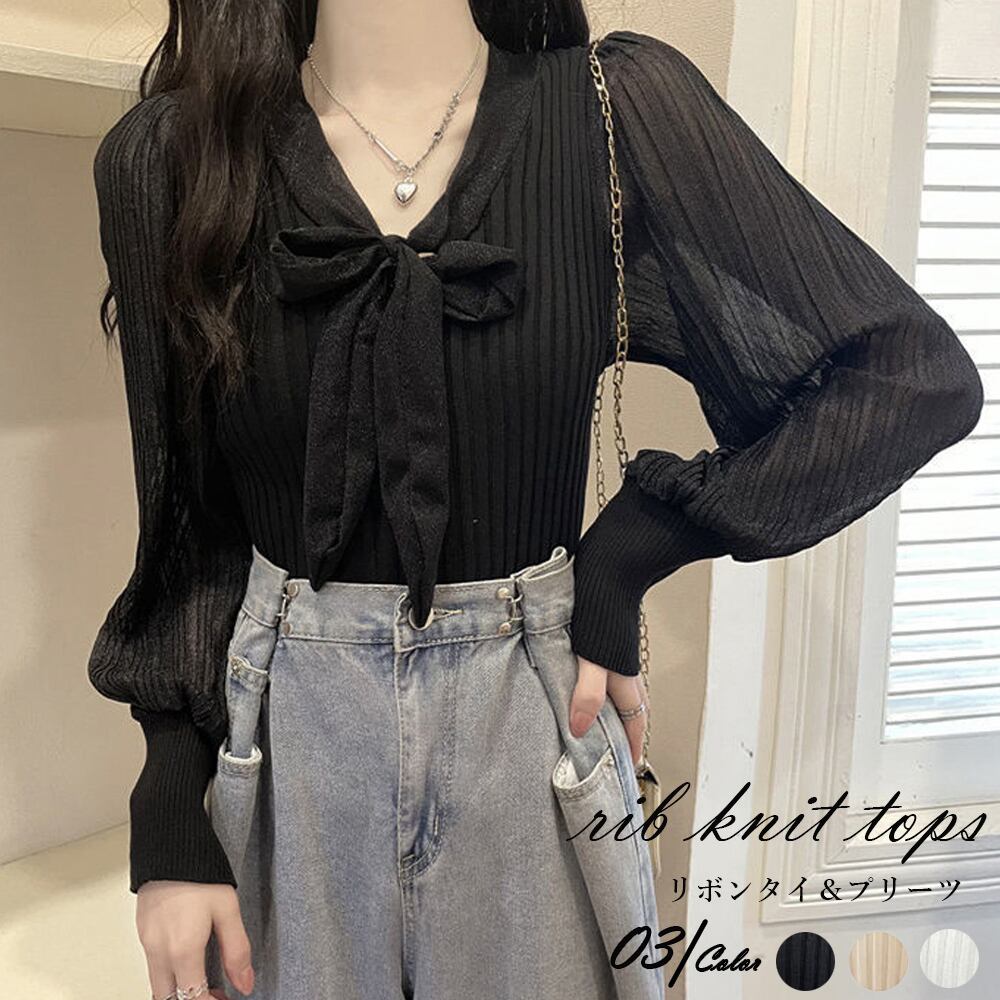 胸元の大きなリボンで一枚でもまたインナーとして着用していただいても上品に演出してくれるプリーツリブニット スリーブは透け感のあるシフォン袖で爽やかに女性らしさをアピール