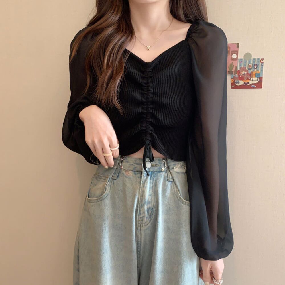 袖透け感 レディース ショート丈ブラウス お洒落 カジュアルニット 着やせニットトップ Vネックニットソー きれいめ トップス
