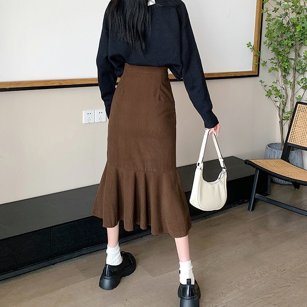 きれいめ 美脚ハイウエストスカート 着やせ エレガント無地ミモレ丈スカート大人 フェミニンスカート 通勤フリルスカート 韓国 人魚スカート