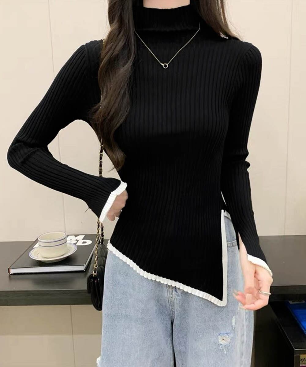 スリット入りで裾ラインに配色デザインが施されたニットトップスです。