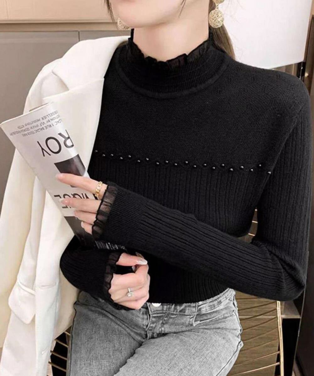 ニットセーターレディース メロウフリルニット パール付きベーシックニットインナー着回し重ね着 レース切替 チクチクしない ニットプルオーバー ニットソーきれいめ フェミニントップス