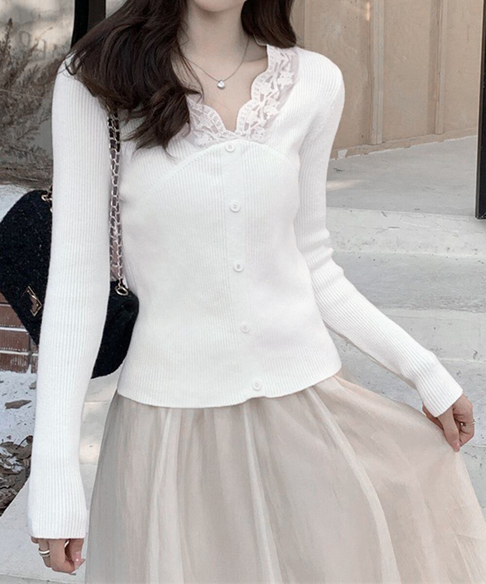 ニットトップス Vネック レース切替え
