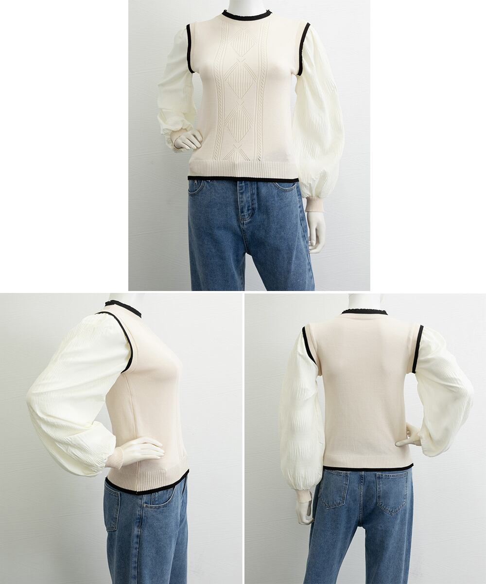 シフォン袖 切り替えニットトップス パフスリーブ ニットプルオーバー 長袖 レイヤード風ニットブラウス クルーネック黒 ドッキングブラウス 重ね着風ニット春秋 きれいめトップス