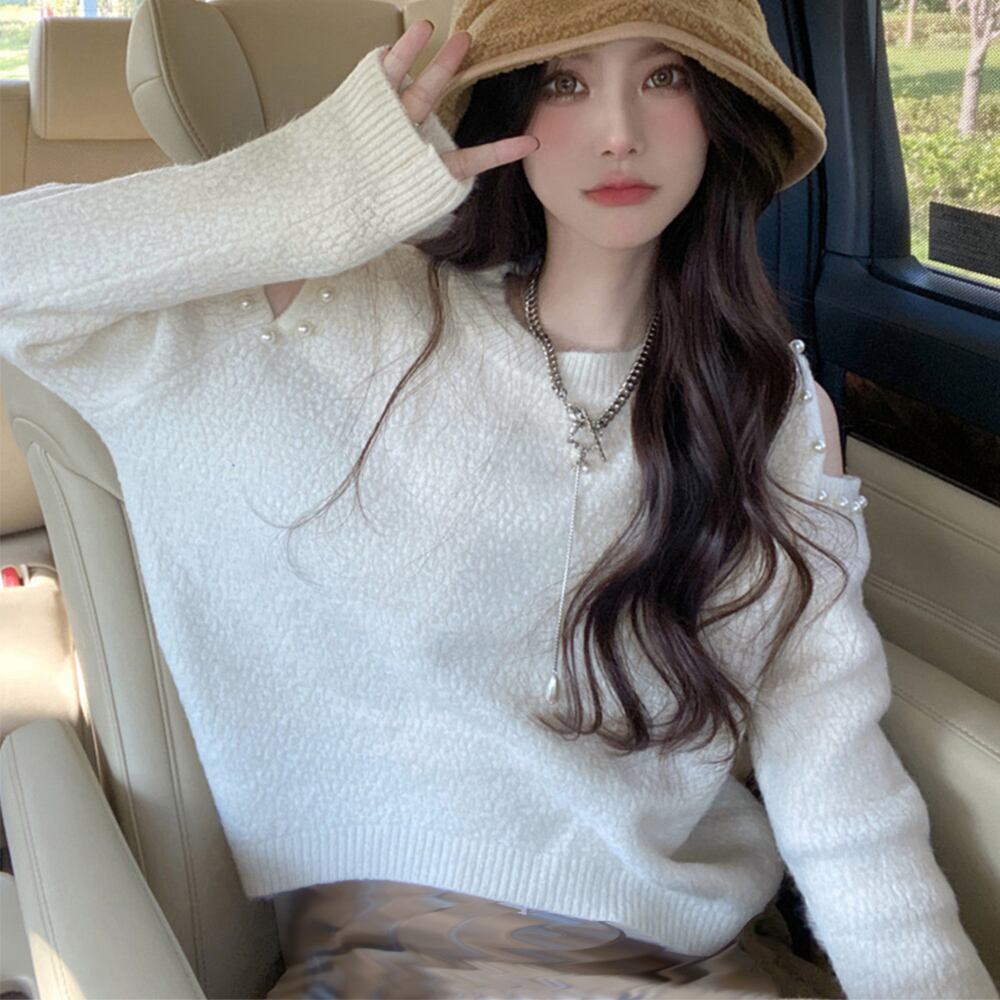 レディース オープンショルダー ニットセーター パール ショートトップス 大人可愛い 韓国カジュアル ニットプルオーバー きれいめニット丸首 ニットウェア春秋冬 肌見せ カットソー