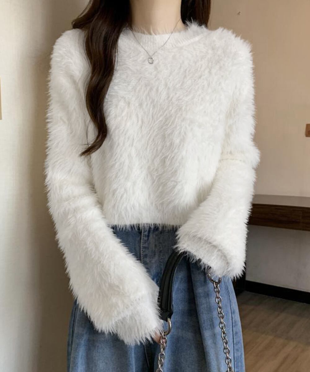 シーズンムード漂う、シャギーのふわふわ感が愛らしいニットトップス。