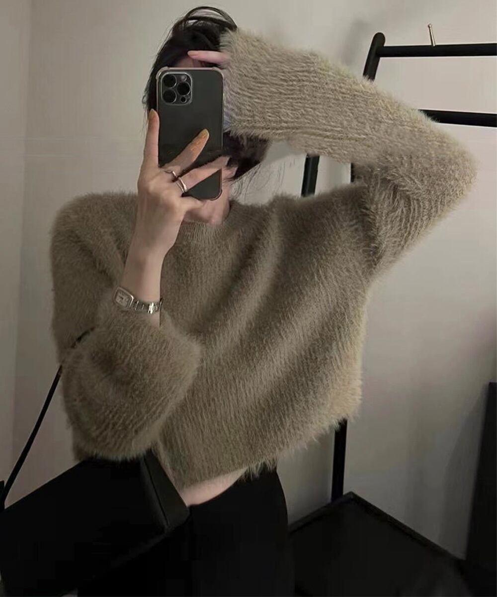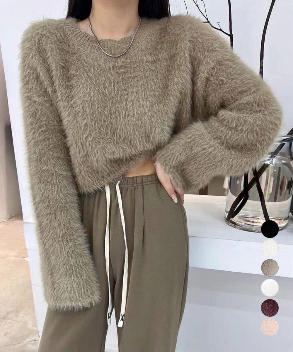 ショート丈ニットトップス 秋冬 ふわふわモヘアトップス 長袖ニットソー オシャレプルオーバー クルーネックニットセーター ゆるニット柔らかい 大人可愛いトップス シンプルニット無地