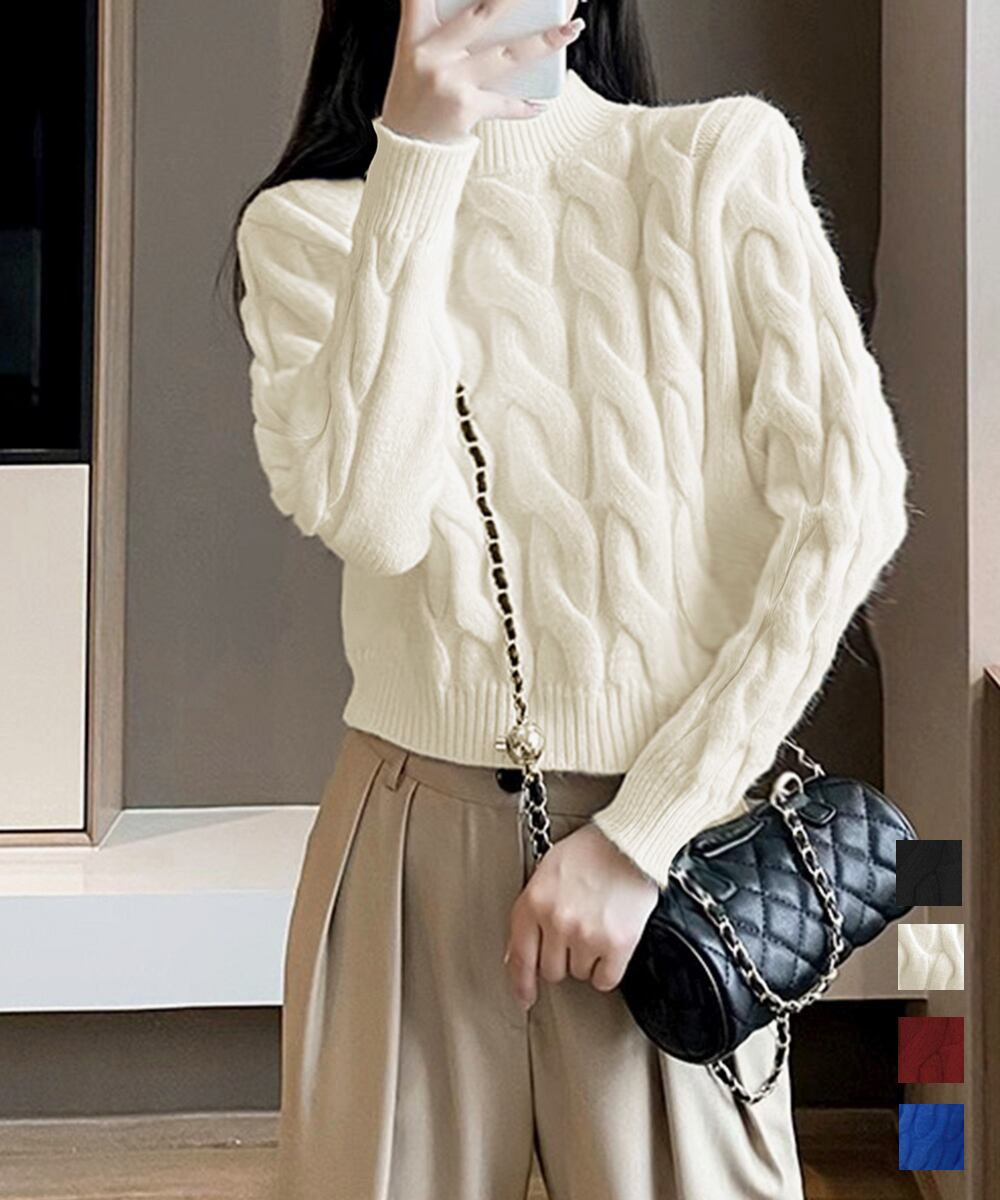 ケーブルニット ラウンドネック プルオーバー カジュアル 長袖 韓国風 ニットソー 大人可愛い ニットセーター 秋冬 ニット暖かい 無地 あったか 通学通勤 ニットウエア