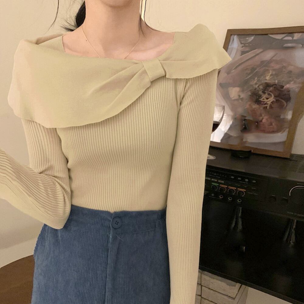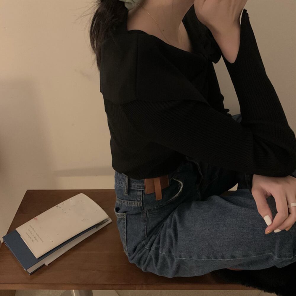 ビッグカラー リブニット スクエアネック デコルテ見せ セクシー ニットウェア 韓国 おしゃれ ニットソーオルチャン ニットプルオーバー きれいめ トップス 大人可愛い長袖無地