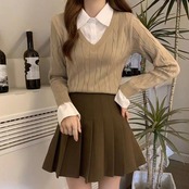 首元と袖元に異素材のシャツ生地を加えるレイヤード風ニットトップス