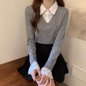 レディース 重ね着風 ドッキングニット シャツ襟切り替え ニットブラウス カジュアルニットソー 春秋冬ニットプルオーバー 異素材ニットトップ 着やせ長袖ブラウス おしゃれニットソー