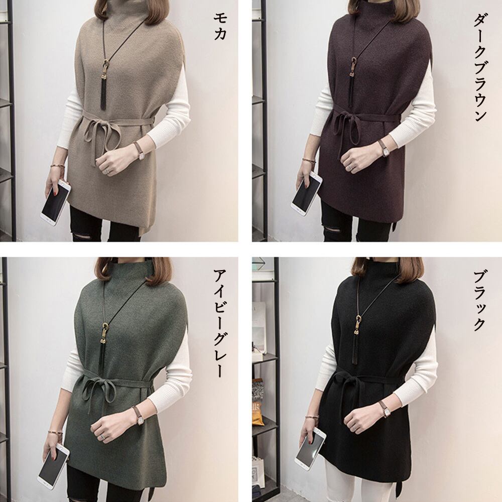 プチハイネック ニットトップス レディース 無地 体型カバー 重ね着 ロングニットベスト 秋冬服 30代40代カジュアル ニットプルオーバー ニットチョッキ 黒
