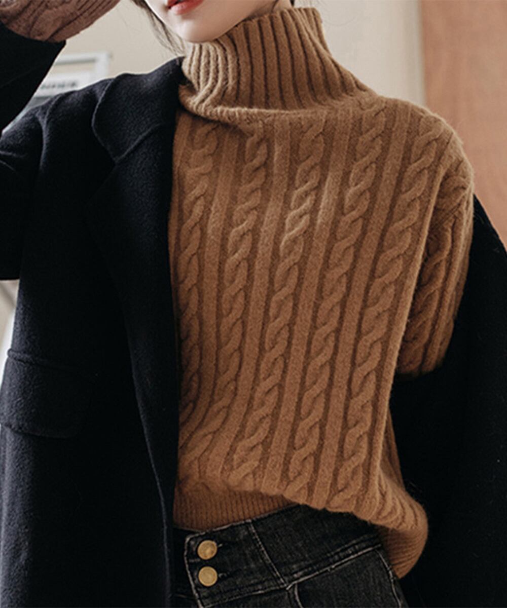 タートルネックニットトップスケーブル編み