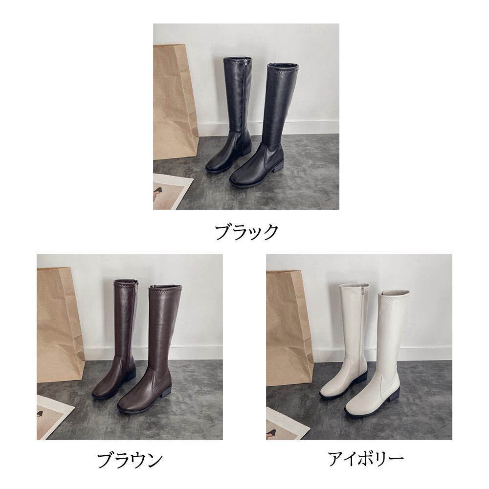 ニーハイブーツ レディース ロング丈 スクエアトゥ ローヒール 合皮 レザー調