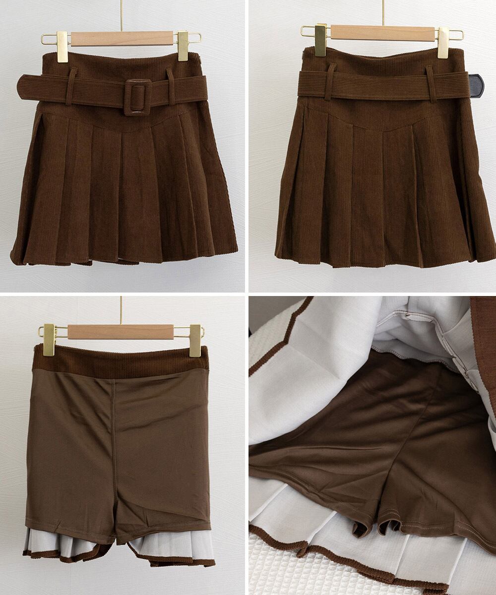 レディース ハイウエスト ショートスカート ベルト付き 韓国風Aラインスカート インナーパンツ付き 着やせボトムスお洒落 膝上丈スカート美脚 フレアスカート秋冬 台形スカート 脚長